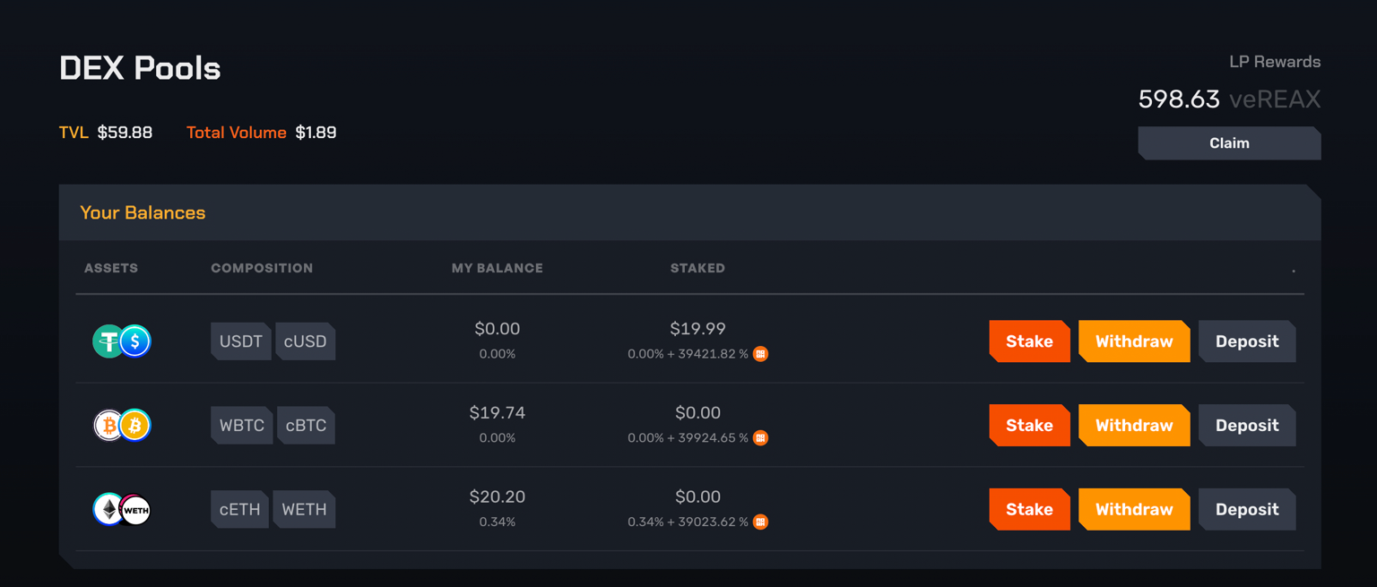 - Vote-Escrow Model: Implemented a vote-escrow system where users can lock REAX tokens for veREAX, gaining boosted yields, governance rights, and fee sharing proportional to their lock duration and amount.