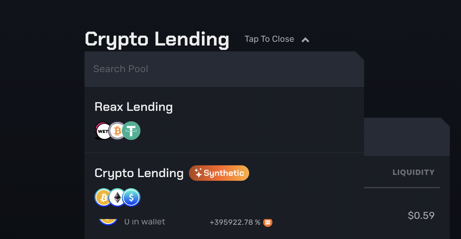 - Isolated Market Design: Engineered separate lending markets for different asset classes, with REAX Lending supporting traditional assets (ETH, BTC, USDT) and Crypto Lending focusing on synthetic assets from the Crypto Synthetic Pool (cETH, cBTC, cUSD).